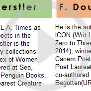 A poet, performance artist and collaborator. Her collections include The Walled Wife (Red Hen Press, 2016), In the Circus of You (Rose Metal Press, 2015), and Becoming Judas (Red Hen Press, 2013). She created the Poetry Circus at L.A.'s Griffith Park Merry-go-round and is director of the Living Poetry Project: "reimagining poetry's influence within the everyday."